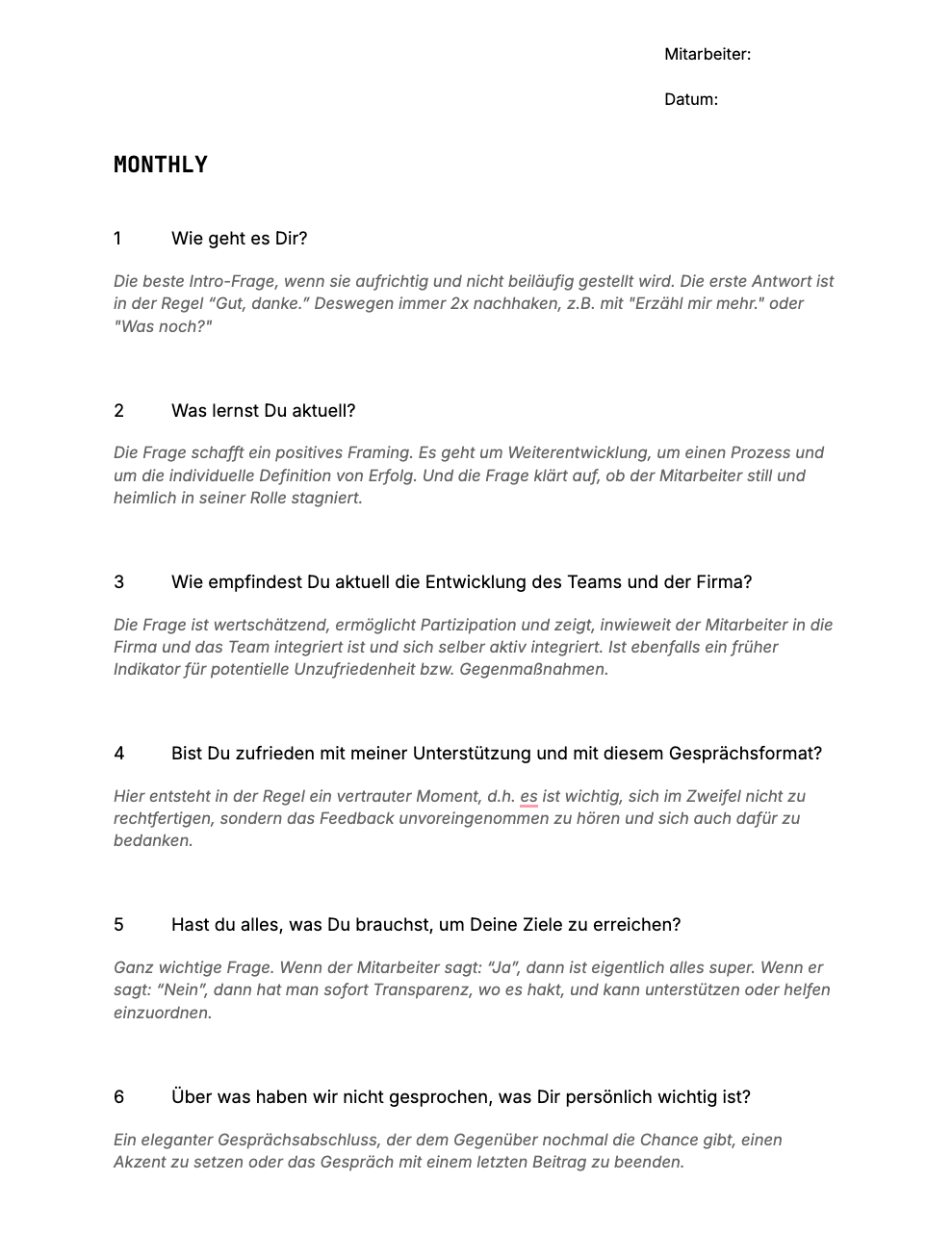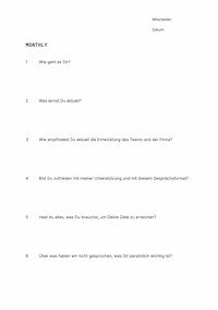 Dieses Template hilft dir dabei, strukturierte und wertschätzende Einzelgespräche mit deinen Mitarbeitern zu führen. Das monatliche Format sorgt dafür, dass wichtige Themen nicht untergehen und schafft eine vertrauensvolle Kommunikationsbasis.